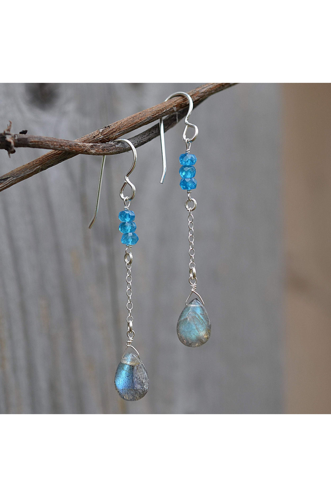 Blue Apatite, Labradorite Gemstone Long Earrings
