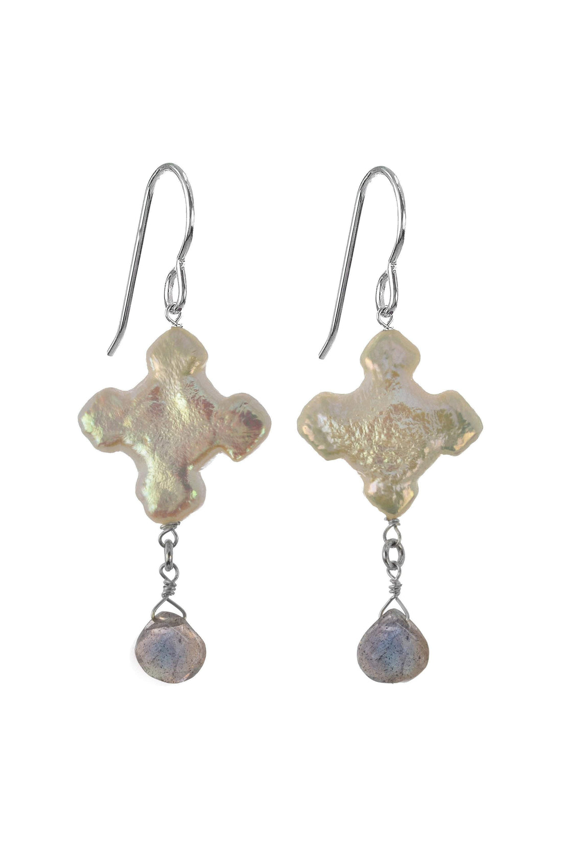 Cross Pearl, Labradorite Silver Dangle Earrings
