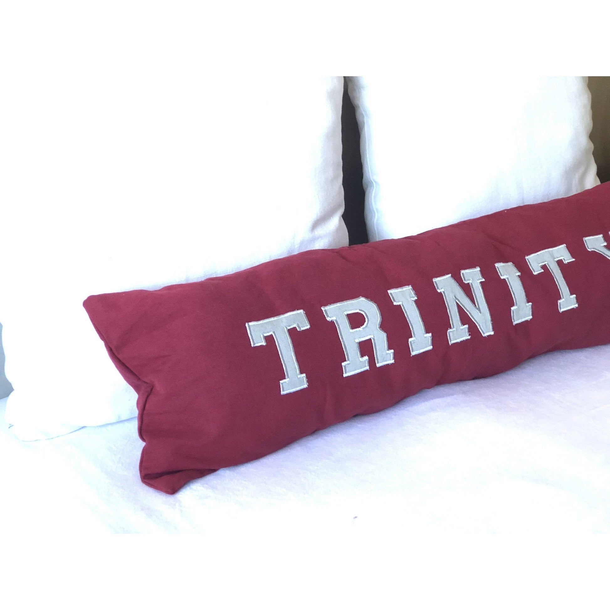 Novel pillow to decorate your college room. Add a punch with any of our hand woven cotton fabric. The letter is hand cut and appliqued on to the pillow cover. The picture shows a 12"x40" inch pillow cover