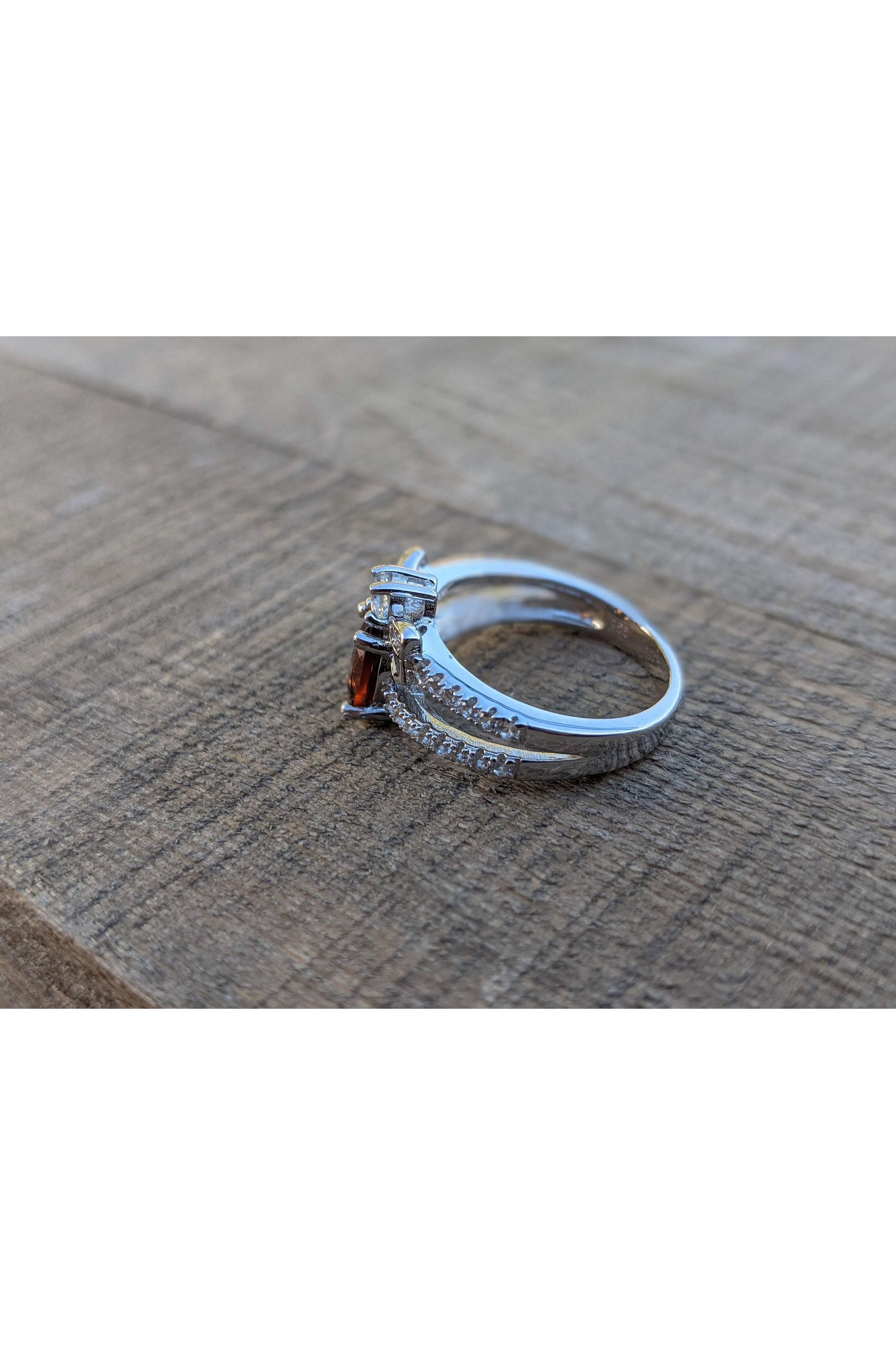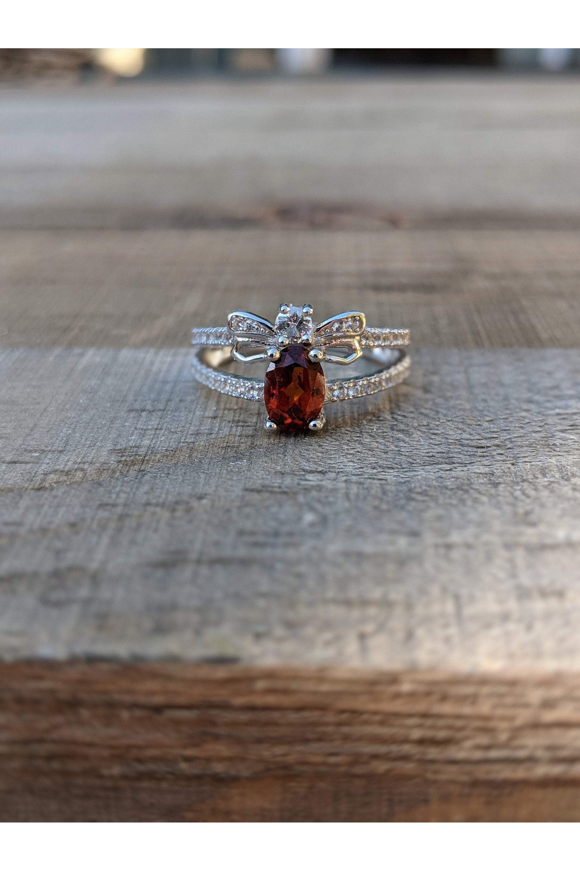Hessonite Garnet Silver Ring, Bee Theme, 7x5 mm Oval Gemstone, Dark Orange Stone, Rhodium Plated Sterling Silver