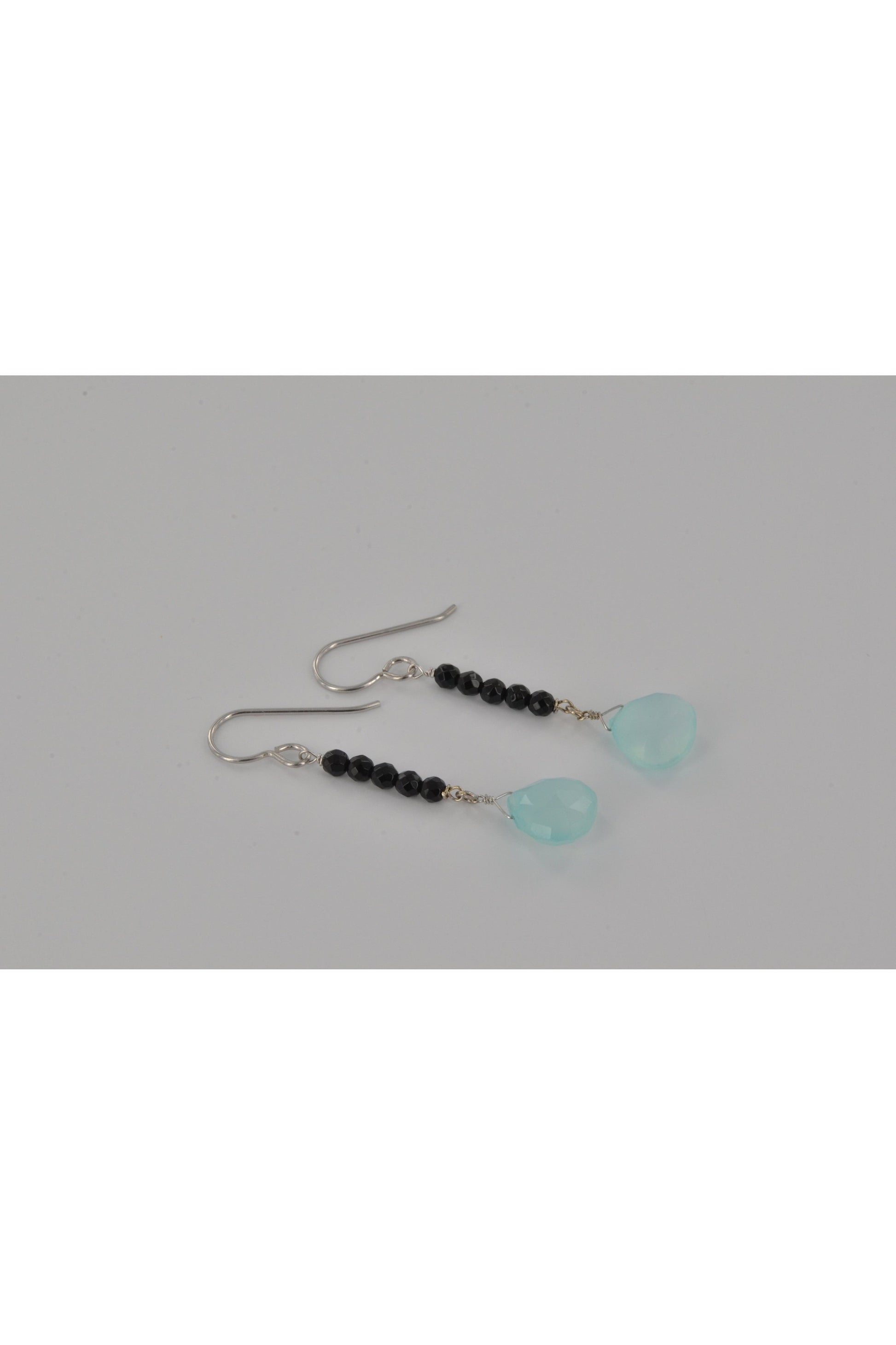 These charming gemstone dangle earrings are handcrafted with genuine Blue Chalcedony and Black Onyx gemstones in 925 Sterling Silver.