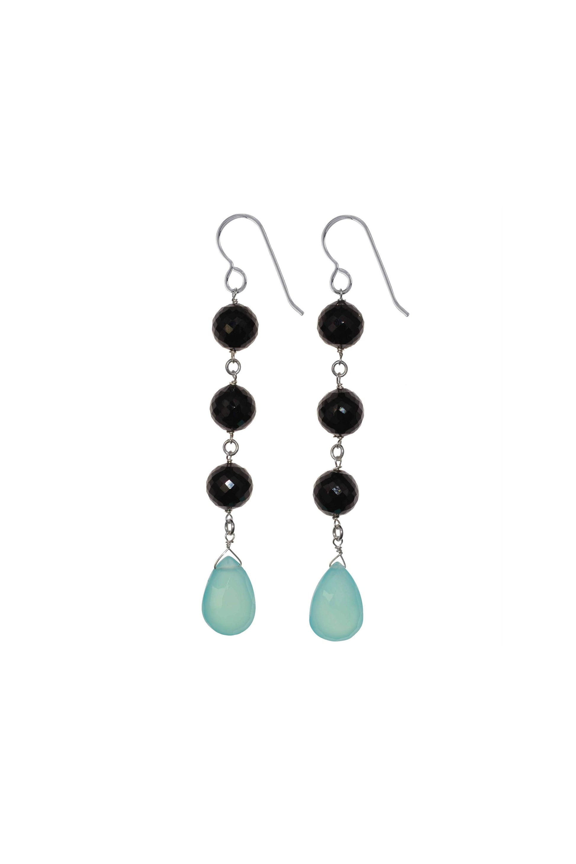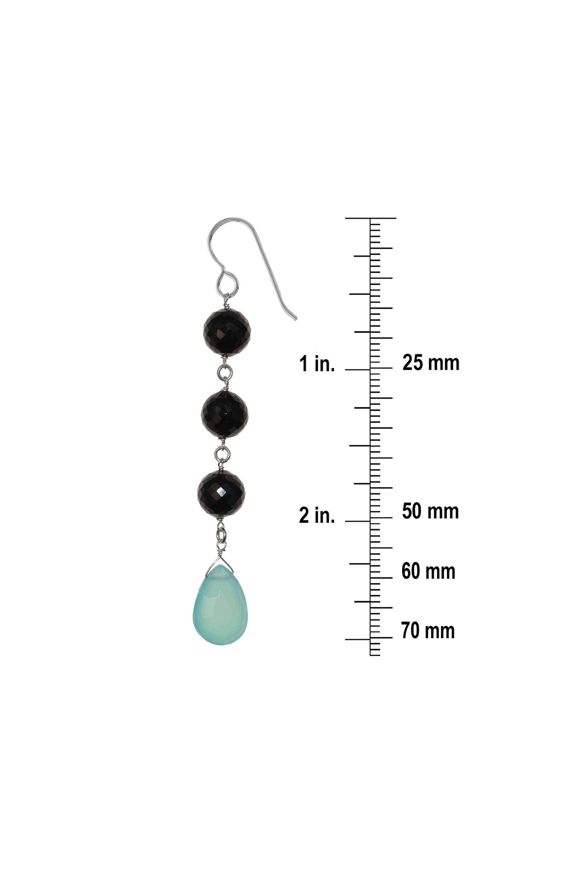 This elegant pair of long dangle earrings are handmade with two carribean sea blue aqua chalcedony briolette gemstones, measuring about 9.50 carats, and accentuated by six black spinel gemstone beads.