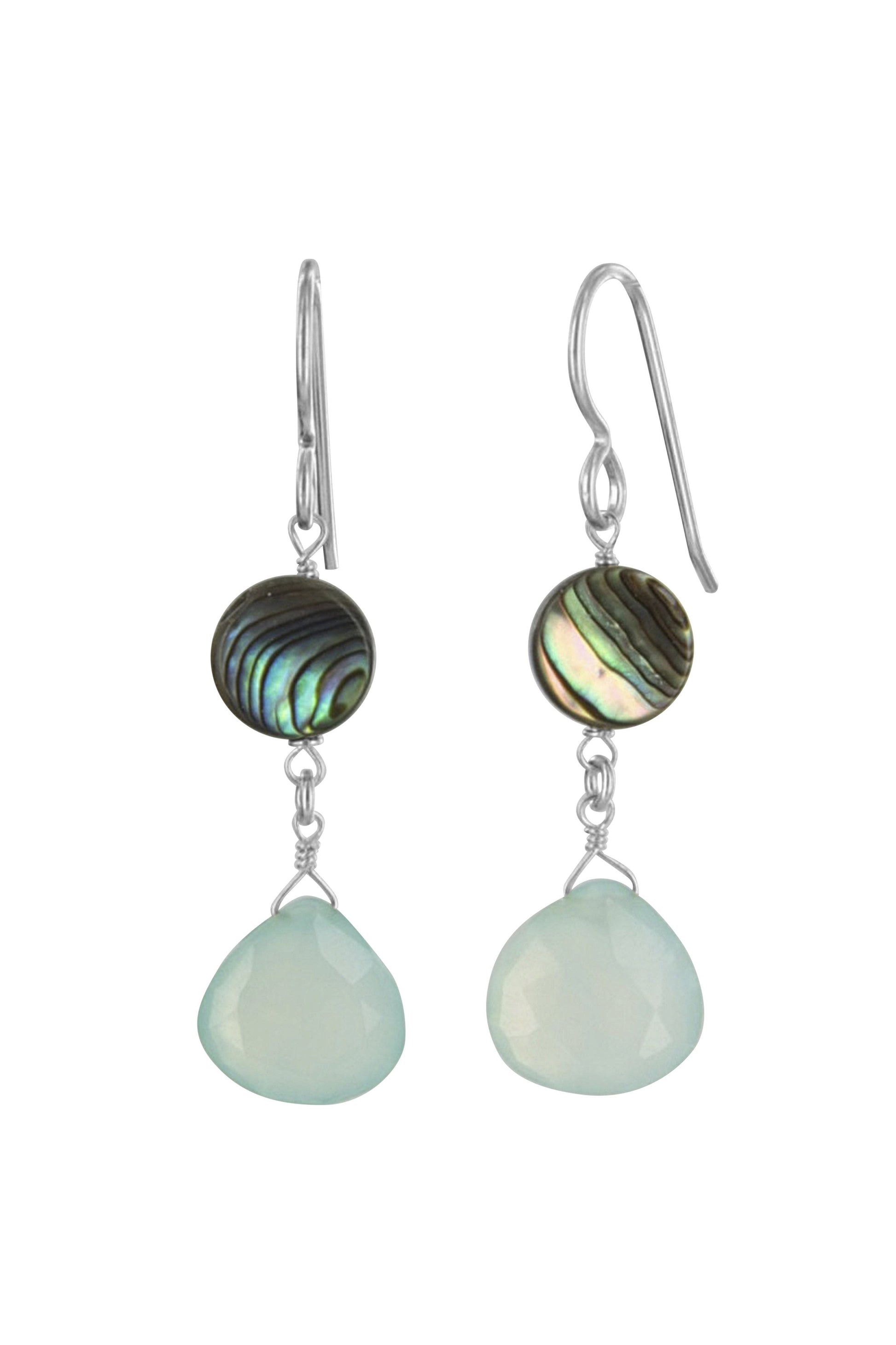 These charming and pretty gemstone earrings are two handmade with Aqua Blue Chalcedony and two Mother of Pearl beads and Sterling Silver.