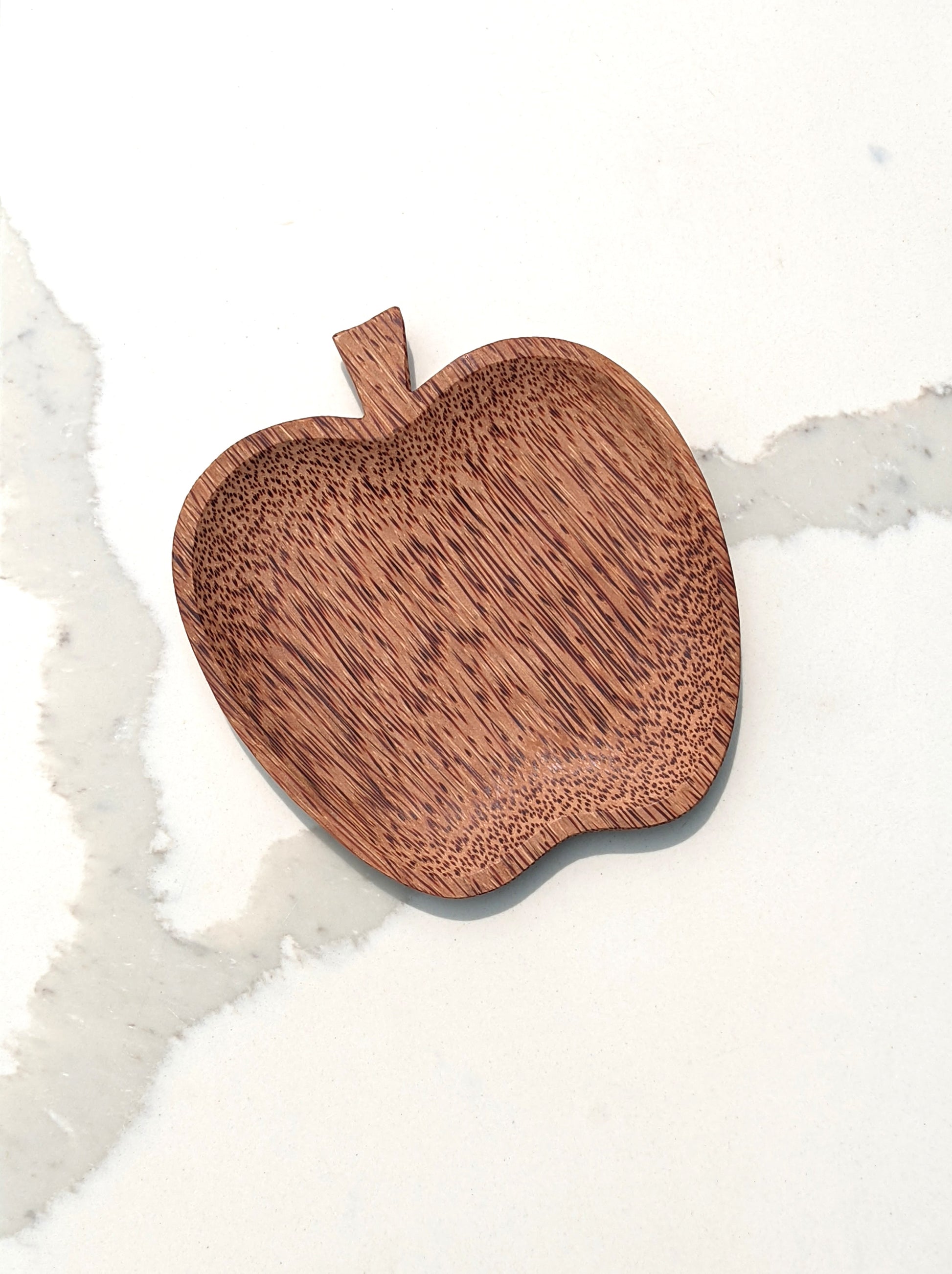 This unique and eco-friendly Coconut Wood Platter shaped like an apple is perfect for serving your favorite appetizers, snacks, or desserts!