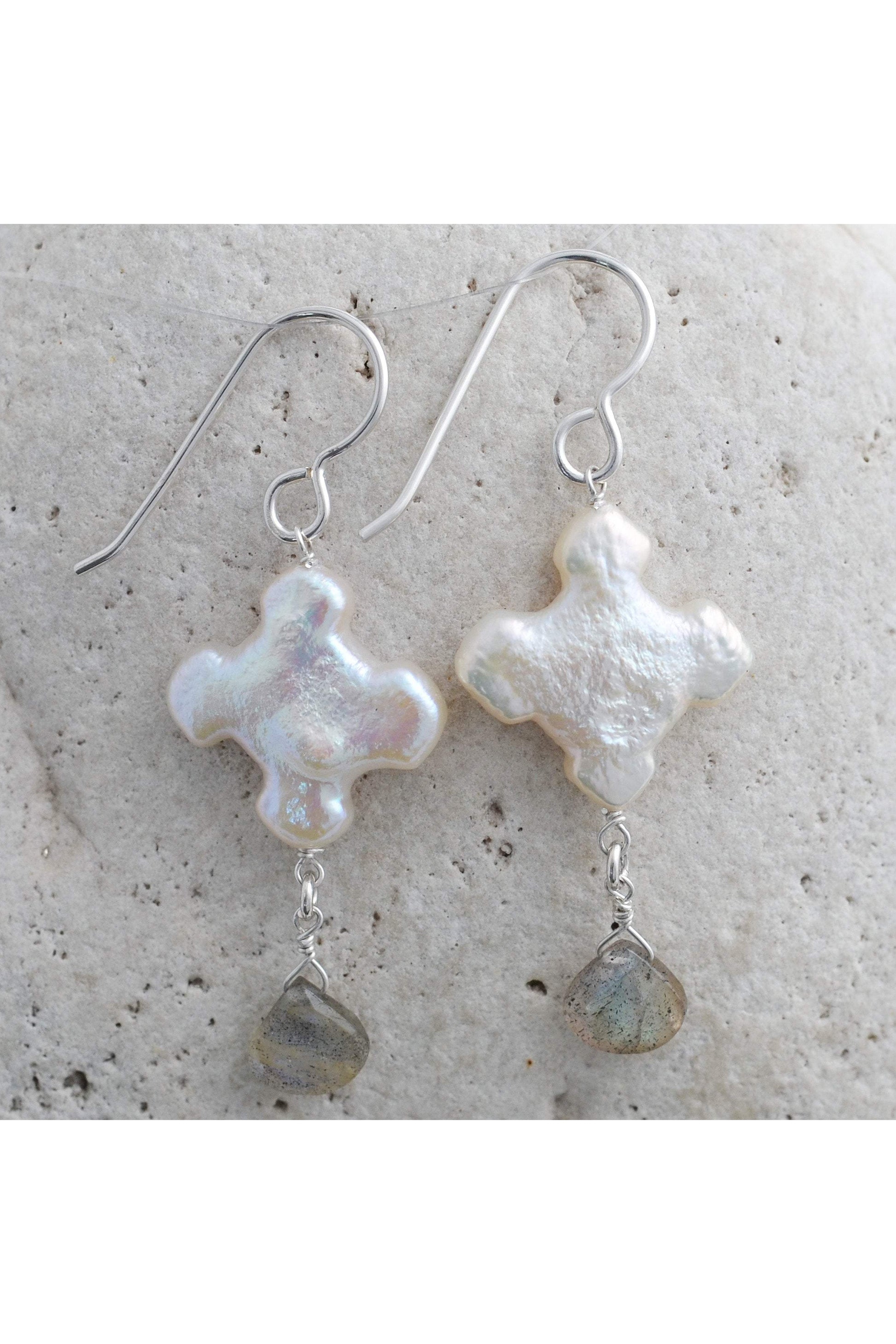 A very unique pair of earrings handmade with unusual Cross-shaped Freshwater Coin Pearls and two faceted Labradorite briolette cut gemstones with 925 Sterling Silver. Will make it a very unique pair of earrings.