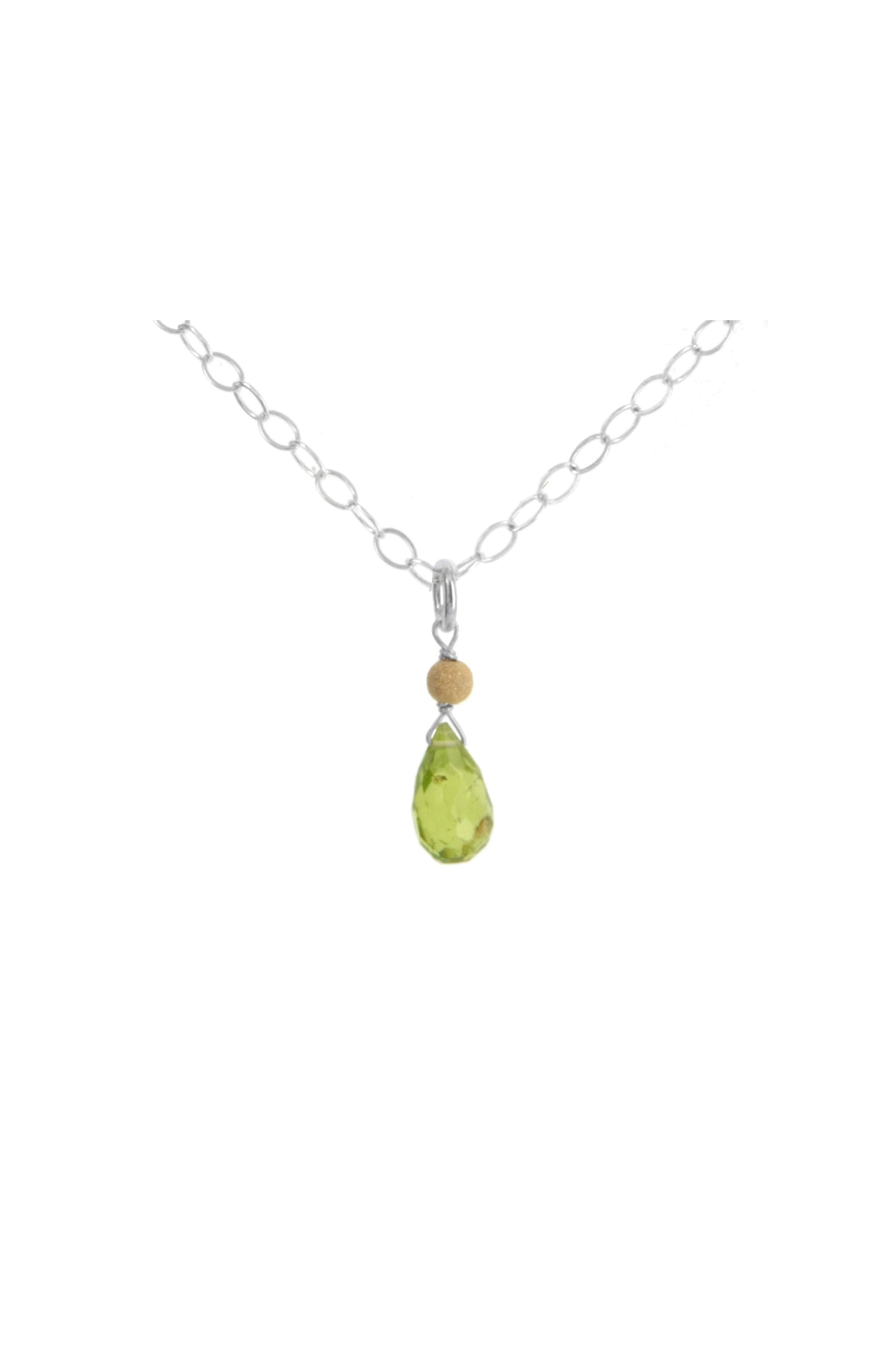 The epitome of effortless chic is this necklace featuring a Peridot briolette gemstone on a 925 Sterling Silver chain. A simple yet fascinating very dainty gemstone pendant.