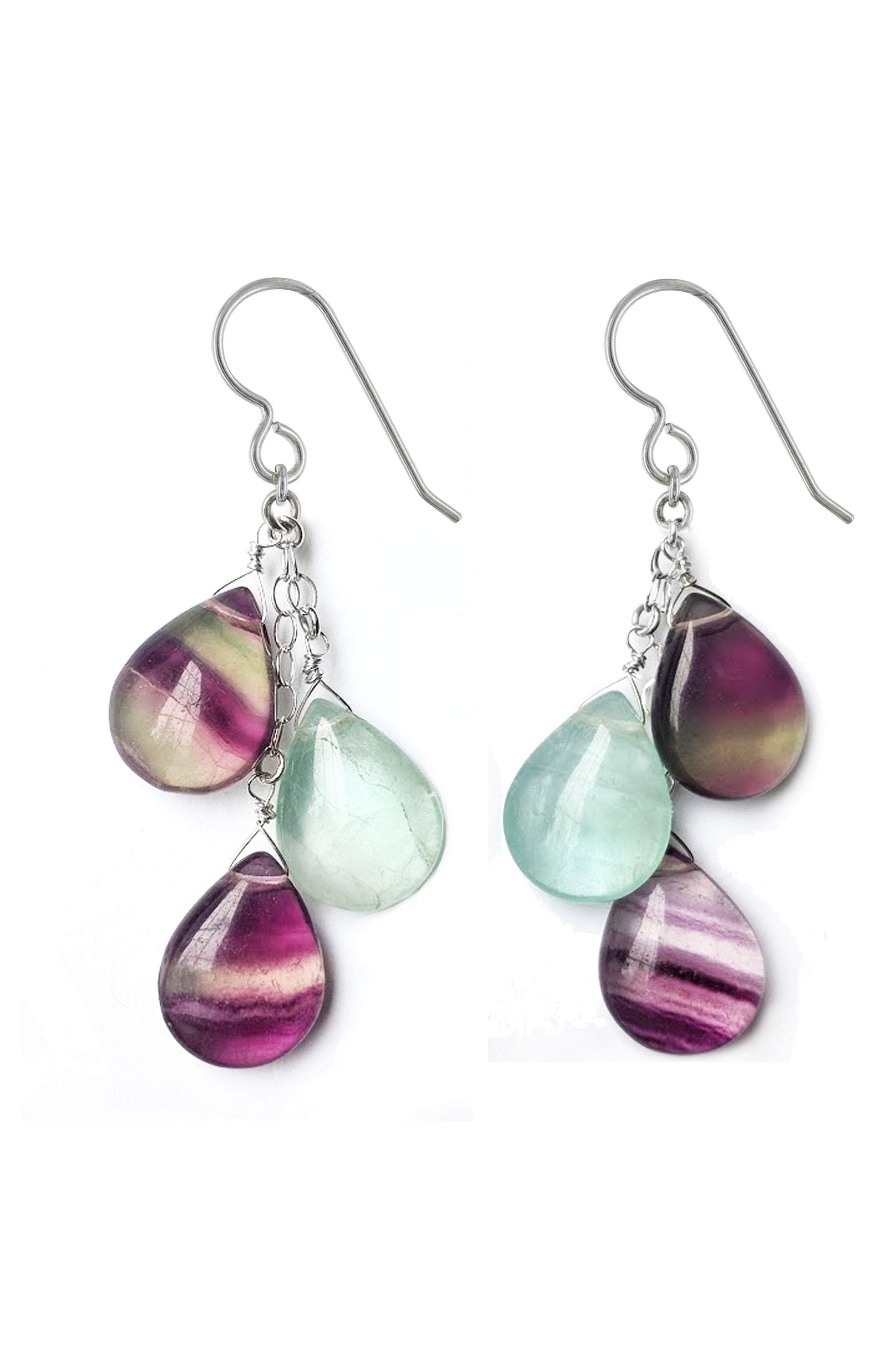 These are really pretty earrings handmade with six polished teardrop shape genuine and untreated Fluorite gemstones and 925 Sterling Silver. The design has a very Bohemian feel to it.