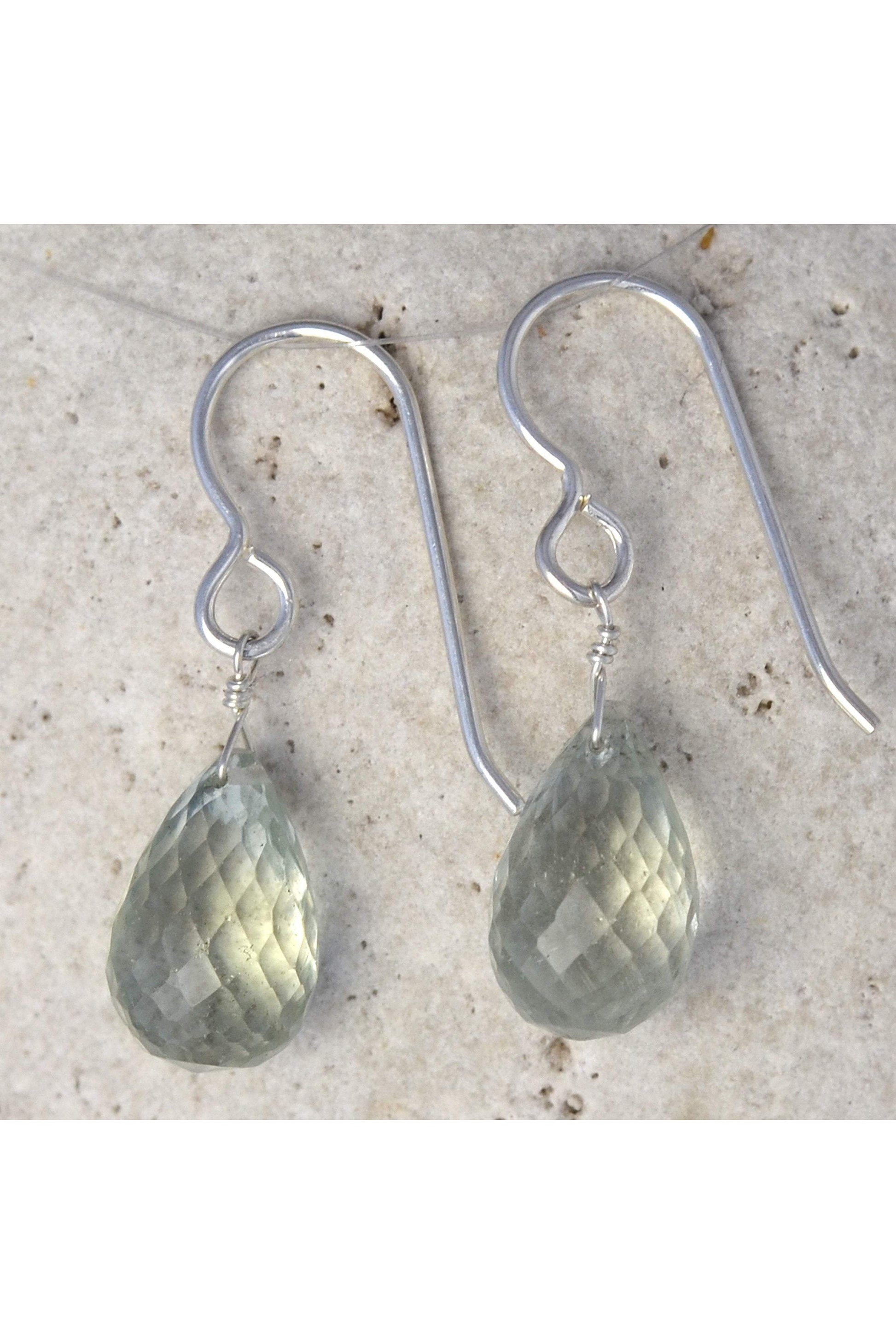 This drop style pair of dangle green earrings are handmade with two beautifully faceted Mint Green Amethyst briolette gemstones, weighing about 10 carats in total weight.