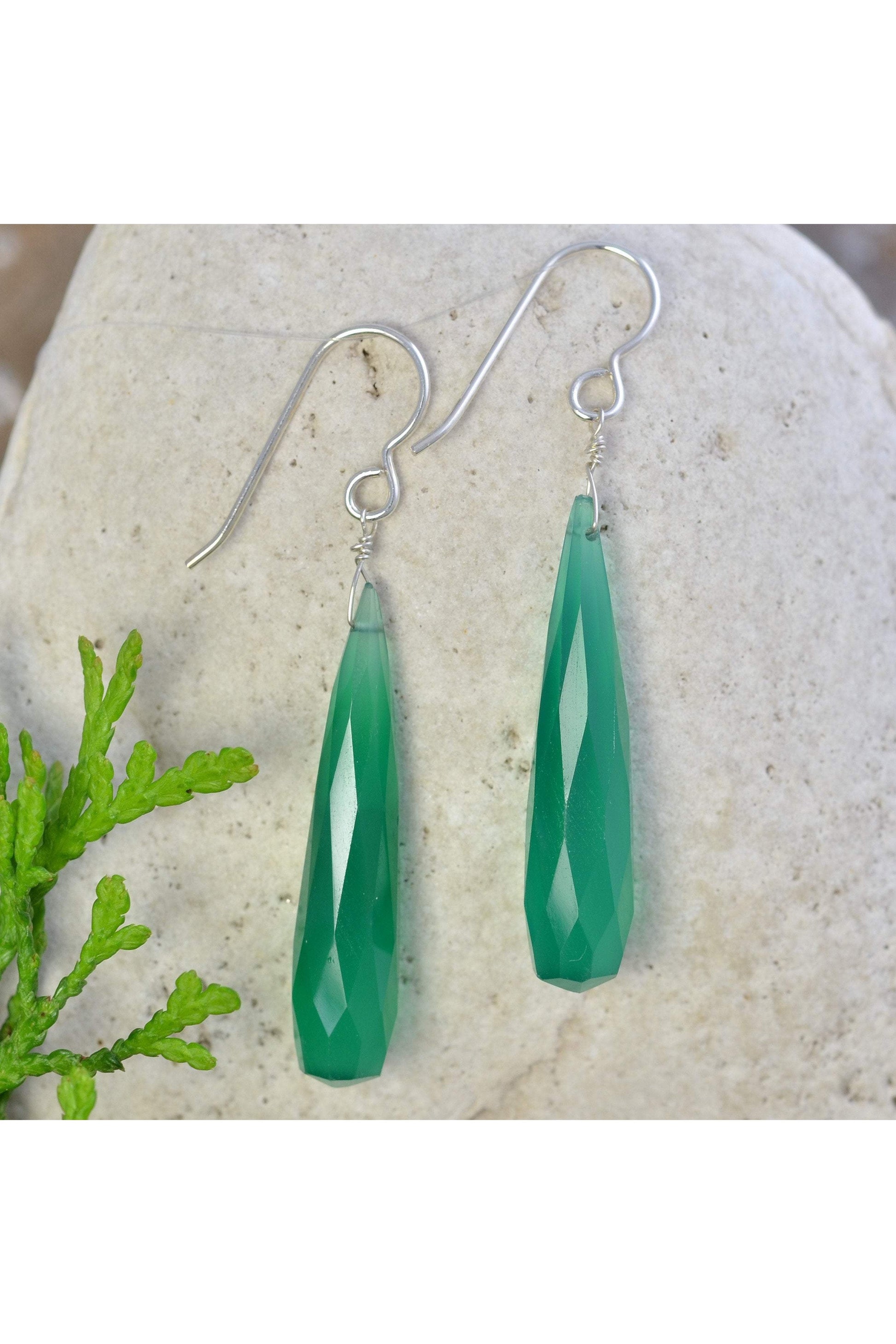 This beautiful elegant pair of long dangle handmade earrings are handmade with two emerald green color chalcedony faceted briolette semi-precious gemstones, measuring about 7 carats in total weight.