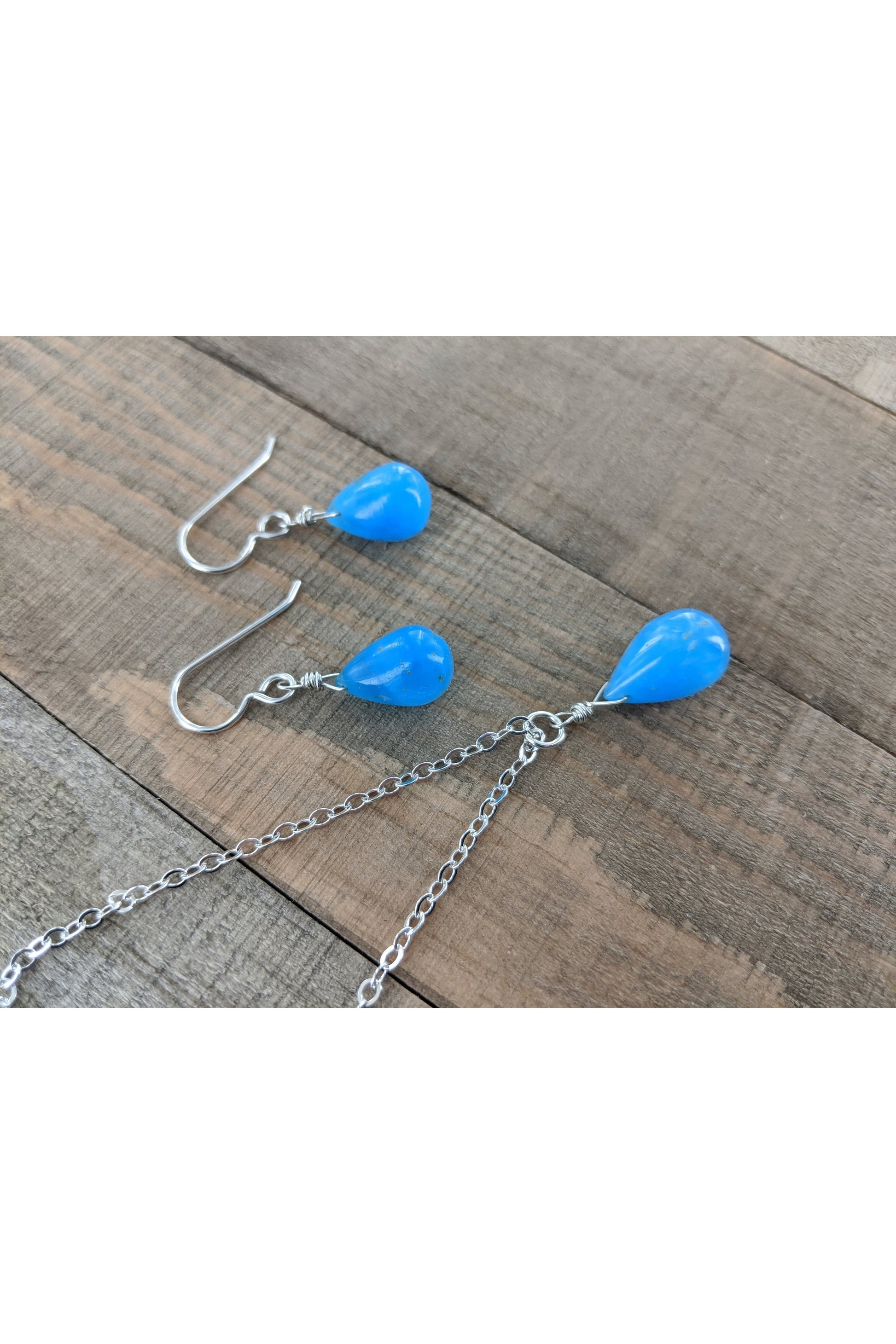 This teardrop dangle pair of blue gemstone earrings and necklace feature rare hemimorphite briolette polished gemstones with 925 Sterling Silver.