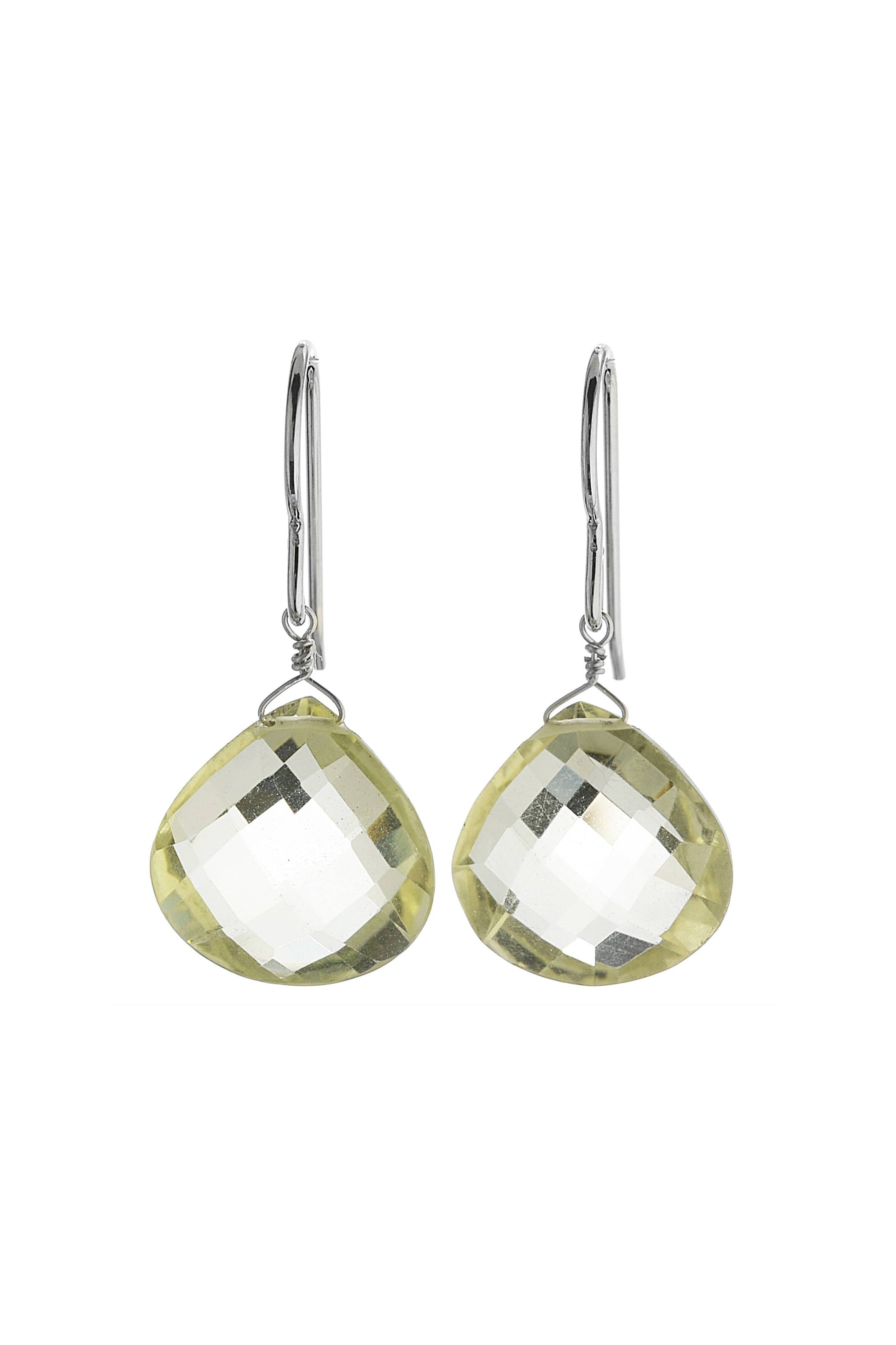 This drop style pair of dangle earrings are handmade with two beautifully faceted large Lemon Quartz briolette gemstones, measuring about 15 carats in total weight.