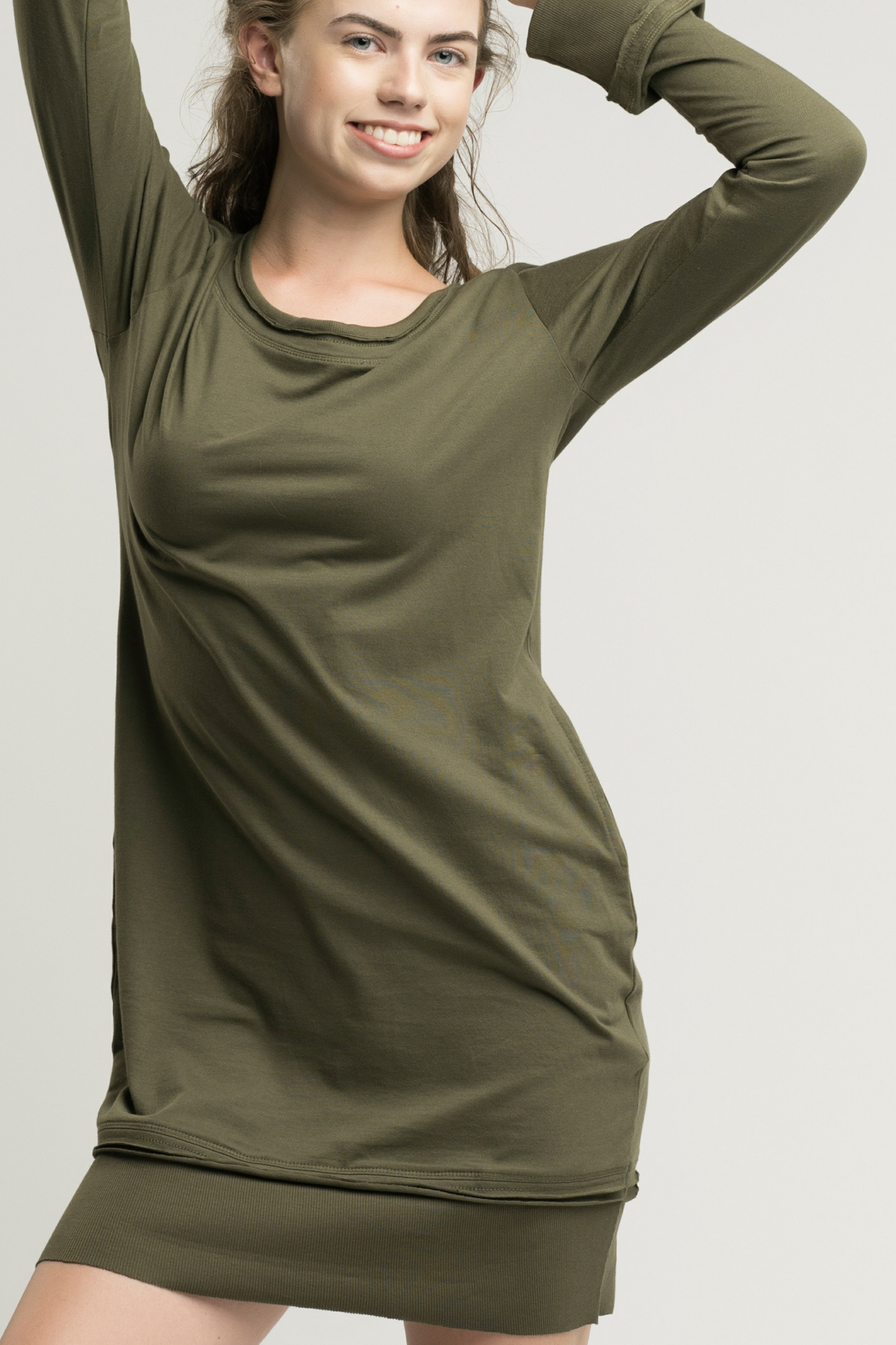 You will love this Olive Green pocket tee dress. Made with organic cotton, this long sleeves pocket dress is perfect to dress up or cozy down.