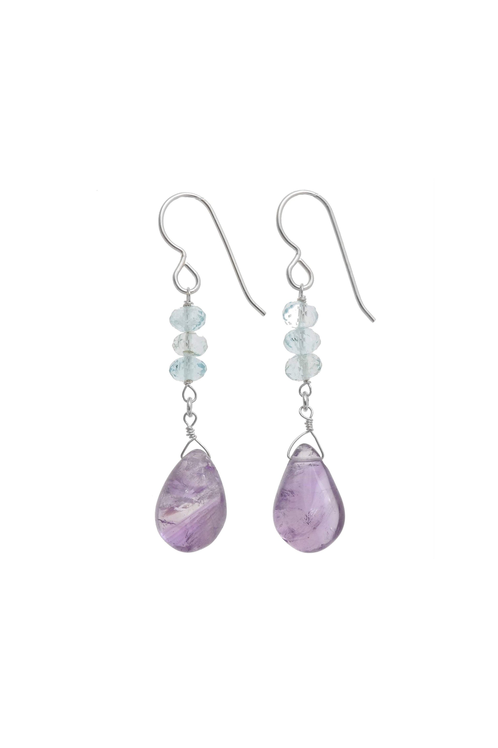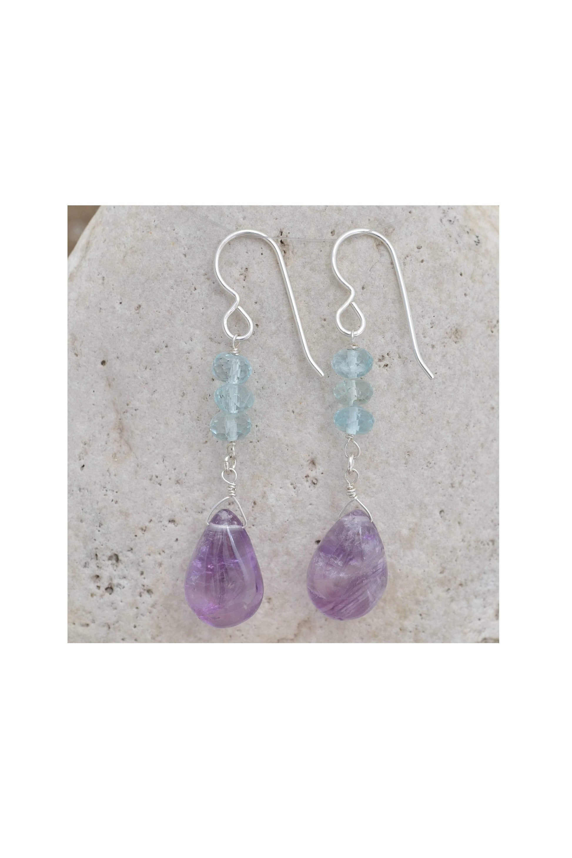This beautiful pair of dangle earrings are handmade with two natural amethyst briolette gemstones, measuring about 11 carats, and accentuated by six aquamarine rondelle gemstone beads.