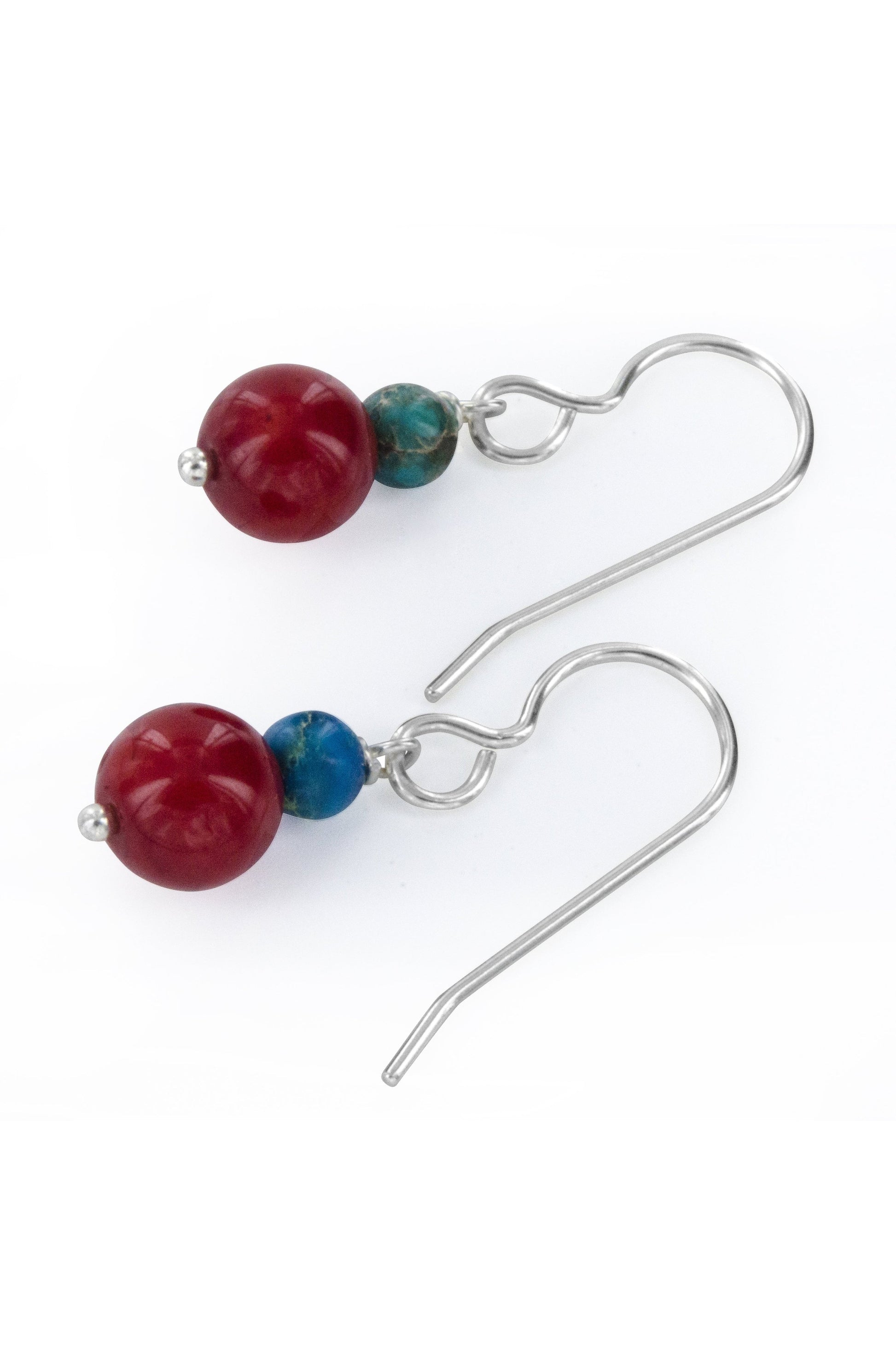 These dainty red earrings are handmade with 925 Sterling Silver and Red Coral beads and Blue Jasper.