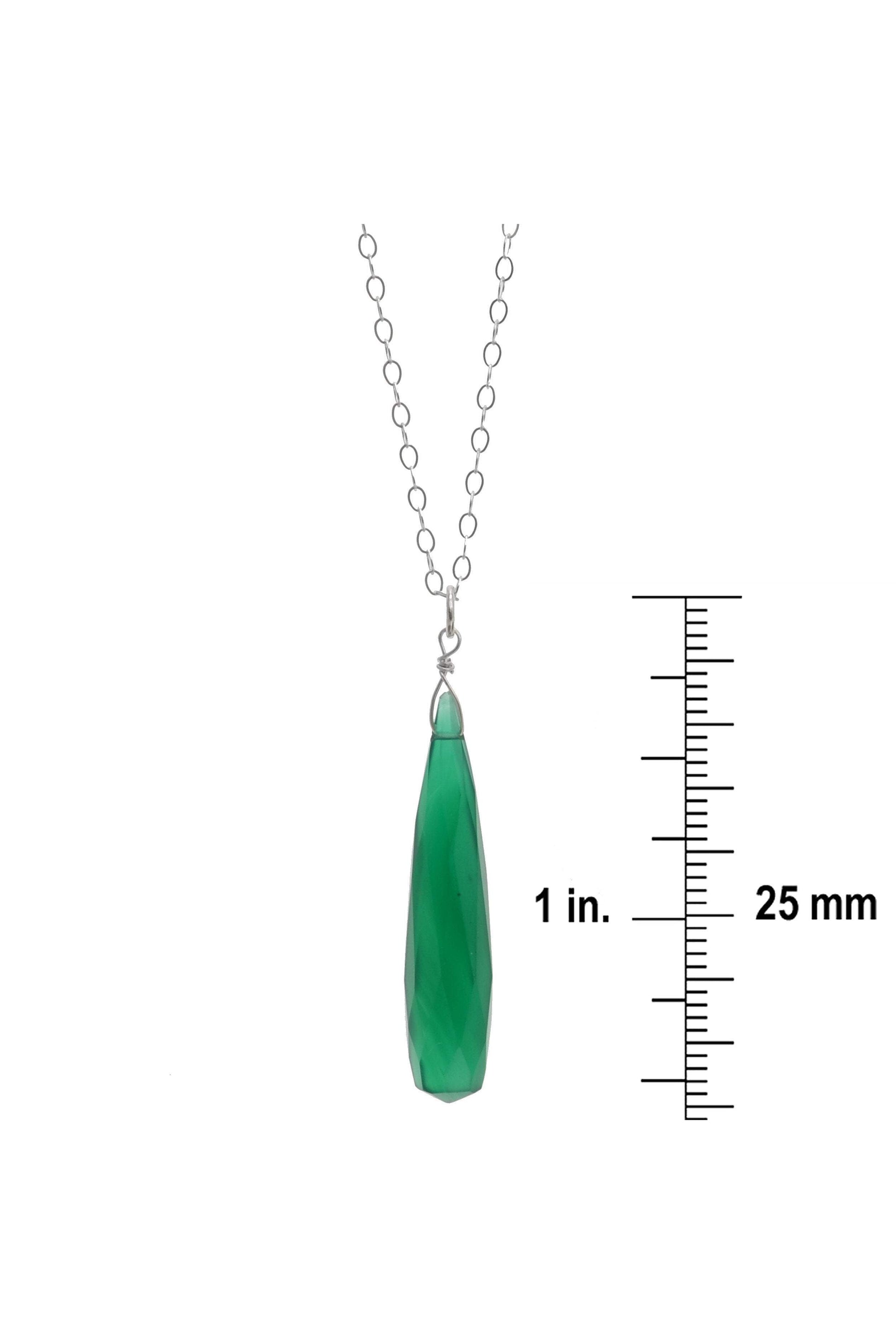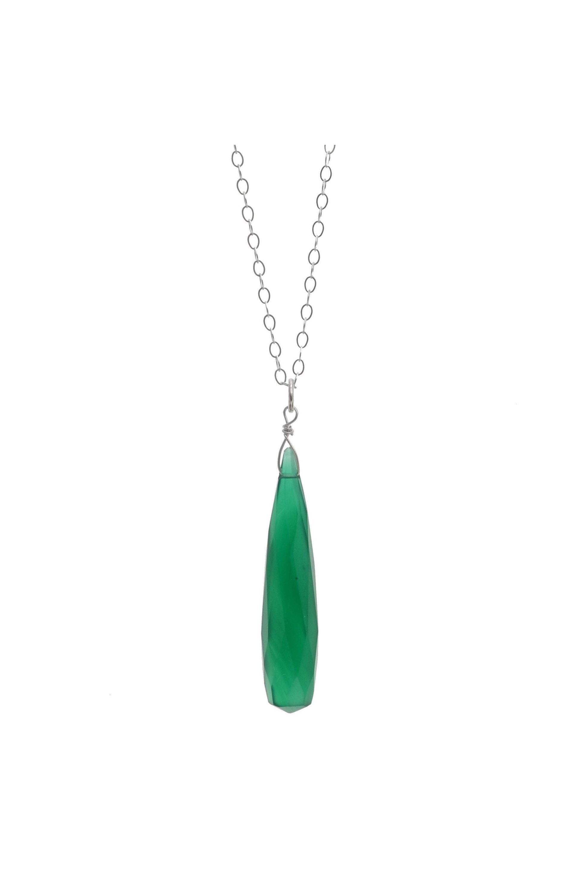 A beautifully cut genuine gemstone necklace handmade with a Green Chalcedony long briolette cut gemstone and an 18 inch Sterling Silver chain.