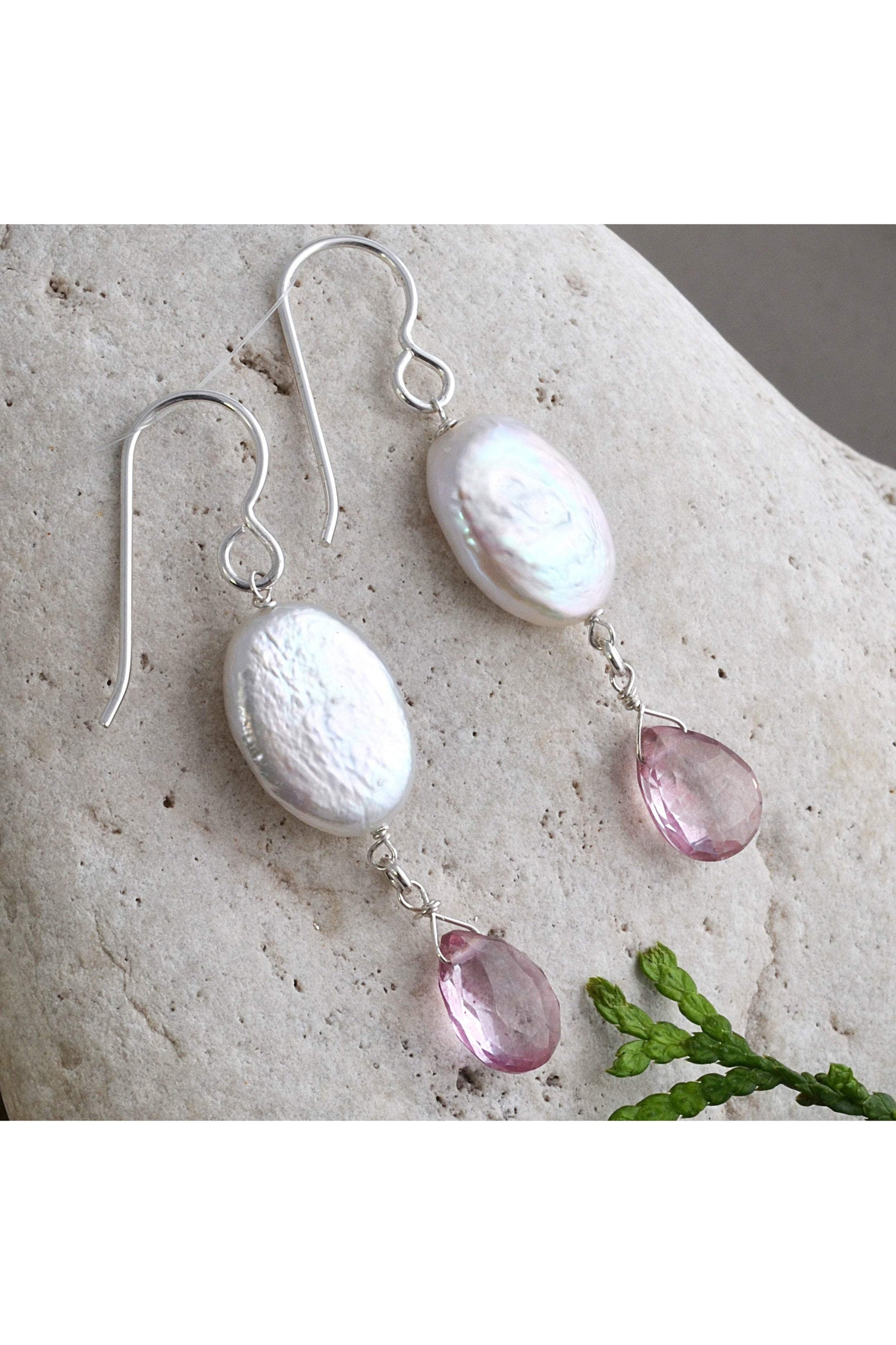 This pair of dangle earrings are handmade with two oval freshwater coin Freshwater Cultured Pearls and two pink quartz faceted briolette gemstones.